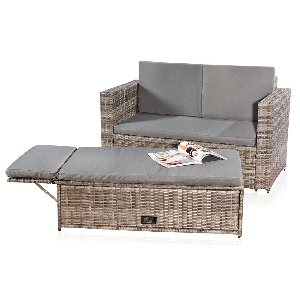 Ihre Wellnessoase im Garten Dieses Möbelset besteht aus einem Zweisitzer-Sofa sowie einer Ottomane. Wann immer Sie sich nach purer Entspannung sehnen, erfüllt Ihnen das Set Ihren Wunsch. Das Sofa besteht ebenso wie die Ottomane aus einem edlen Polyrattan-Geflecht, das durch seinen Lounge-Chic begeistert. Das Möbelset ist robust und bestens für die tägliche Nutzung geeignet. Mehr Entspannung versprechen die bequemen, beigefarbenen Sitzkissen. Die Kissen bestehen aus Polyester und sind sowohl optisch als auch von den Maßen her perfekt an die Möbelstücke angepasst. Je nach Wunsch können Sie die Ottomane als Sitzfläche nutzen oder sie mit dem Sofa kombinieren und Ihre Beine entspannt hochlegen. Auch in Sachen Stauraum bietet Ihnen die Ottomane mehr Flexibilität: Im Inneren haben Sie die Möglichkeit, Kissen und andere Gegenstände zu deponieren. Das Set wurde aus wetterfestem Polyrattan gefertigt und zeichnet sich so durch ein geringes Eigengewicht aus. Ein Metallgestell sorgt für Stabilität.Entdecken Sie dieses schicke Möbelset und blicken Sie sonnigen Tagen mit viel Vorfreude entgegen.